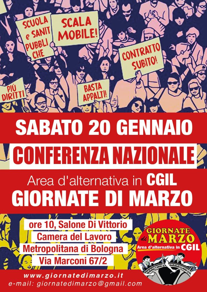 Il 20 gennaio si terrà a Bologna la conferenza nazionale dell’Area di Alternativa in Cgil “Giornate di Marzo”. Un’assemblea, a cui parteciperanno delegate e delegati, lavoratrici e lavoratori, che segue un percorso che si è sviluppato nei territori sulla base di una bozza di “tesi sindacali” che metteremo successivamente a disposizione. Di seguito la locandina dell’evento.